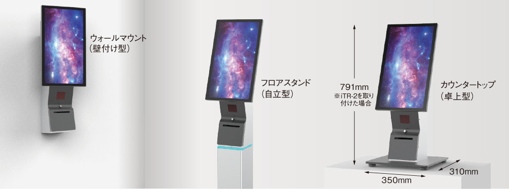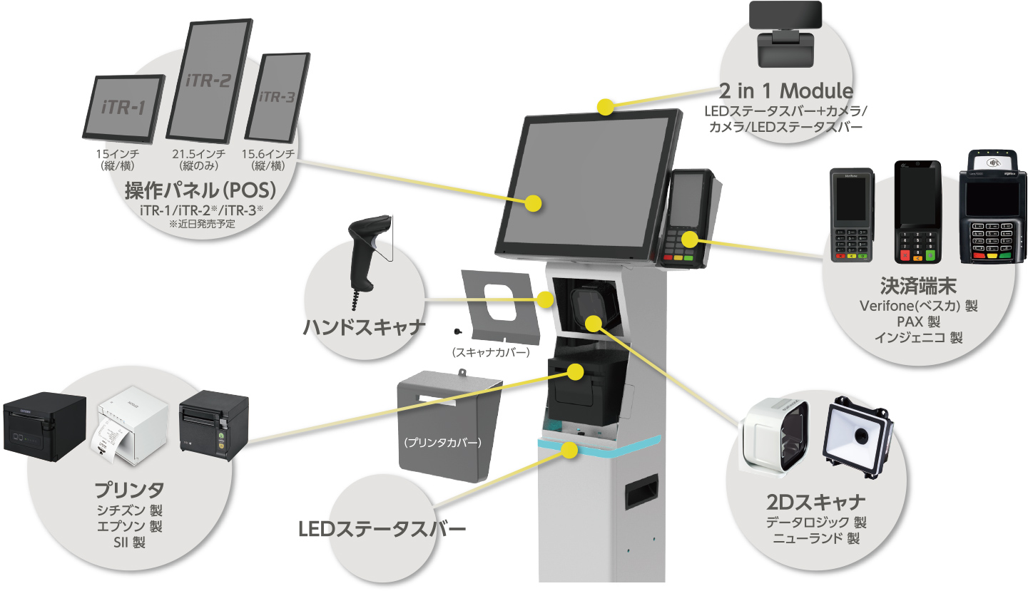 Varie(バリエ)シリーズは当社製のPOS端末『iTRシリーズ』を核とした多目的セルフターミナルです。周辺機器(スキャナ、レシートプリンタ、決済端末等)とスタンドオプション(カゴ置き台等)を組み合わせることによりエンドユーザーの運用目的に最適な機器構成を実現できます。幅広い分野の様々な用途でご利用頂けるよう、操作パネル部は「Windows®10 IoT Enterprise」OSを搭載したPOS『iTRシリーズ』を採用。ソフトウェアやシステム構成によりセルフレジやKIOSK端末などタッチパネル端末としてご採用頂けます。